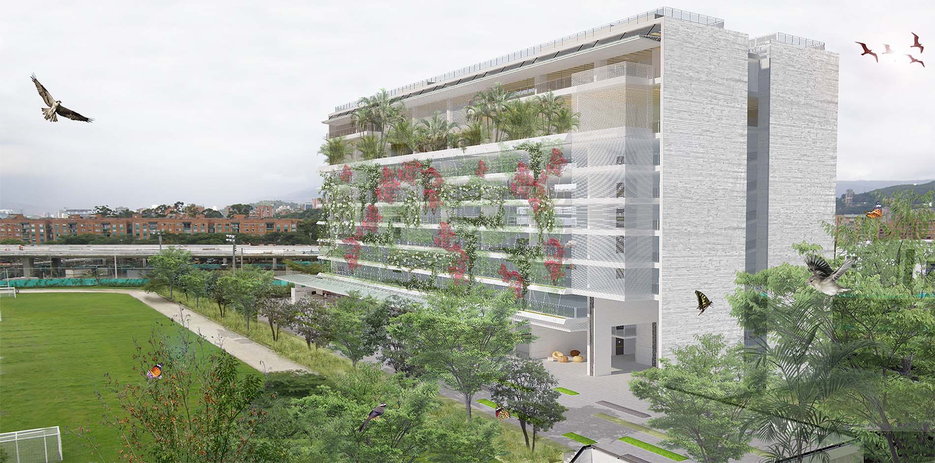 Edificio Multiproposito: Coordinación de estudios y diseños arquitectónicos del edificio «Multiproposito» para la universidad EAFIT, el cual incluye aulas, zonas de estudio, cafeterías y áreas de recreación y descanso para los estudiantes, restaurante, locales comerciales para la universidad, oficinas de profesores, salas de reuniones para uso académico, baños y zonas de servicio, parqueaderos, plazoleta cubierta y todas las obras de urbanismo complementarias, para un total de área construida de 28.324,82 m².
